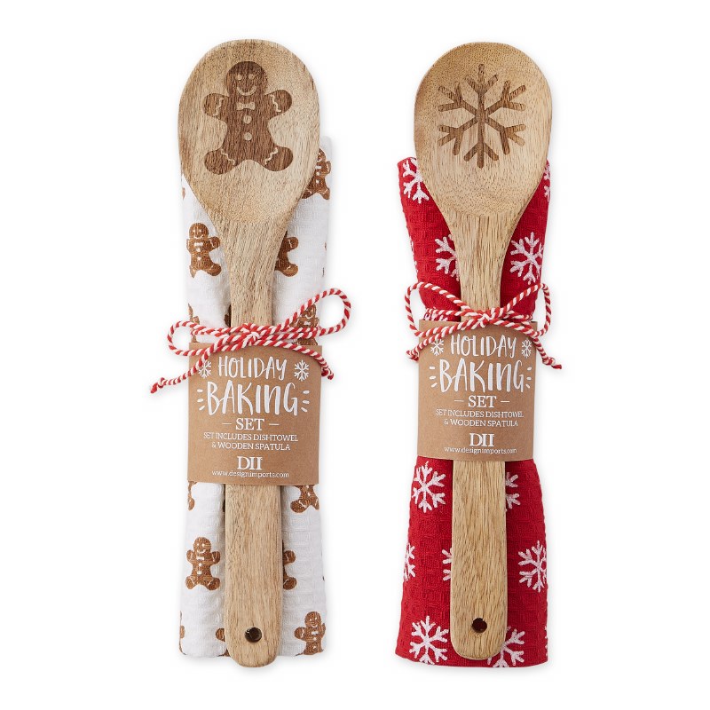 Includes wooden spoon and coordinating dish towel, gift wrapped with a tie. Each sold separately, indicate gingerbread or snowflake in the comment field at checkout.