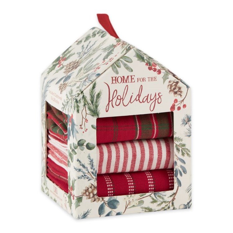 Set includes 1 plaid and 2 striped dishtowels in a decoratine giftbox
