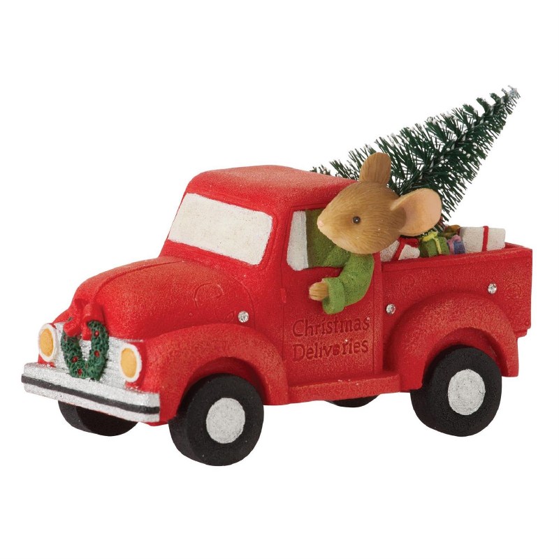 Steering down snowy streets, this mouse is on a mission to spread the holiday spirit by the truckload. Driving a wreath adorned red pickup full of Christmas deliveries, this mouse transports prettily wrapped presents and trees around town.