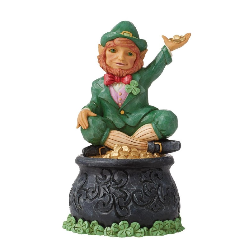 Sitting atop a cauldron of golden coins, this cheerful leprechaun offers you his fortune with a smile. With flowers and clovers this rosemaling pot of gold looks great anywhere in a home, not just at the end of a rainbow! Spread luck with Jim Shore.
