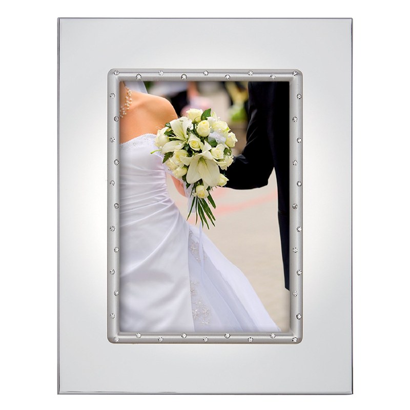 Crafted of silver-plated metal Crystal gems decorate the frame opening Holds a 5" x 7" photo
