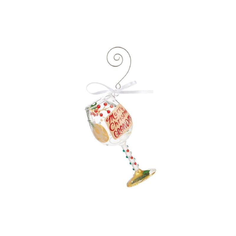 This festive miniature wine glass ornament was made for grandma. With red and green bedazzled crystals, this glass features sparkling white poinsettias, holly branches, and poured holiday spirits. A golden ornament and gift tag signal Christmas.