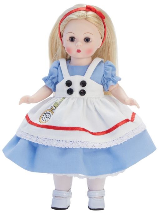 The 8” Alice collectible doll has light skin, blue eyes, and blonde hair. Her hair is long and straight with a side part. The doll is dressed in a pale blue dress with a white pinafore with red ribbon trim, black buttons, and embroidered pocket watch and also comes with a red hair ribbon, white tights and white mary jane shoes. Recommended for ages 14+