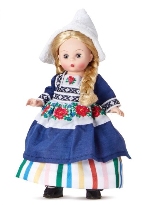 Wendy joins the International Collection as a little Dutch girl from the Netherlands. Measuring 8", she is made of vinyl and is fully-articulated for fun play with jointing at her neck, shoulders, elbows, waist, hips and knees. She has classic red lips, soft rosy cheeks and blue-gray eyes that open and close. Her long blond hair is styled in braids and topped with a traditional Dutch cap. Wendy wears a blue pinafore with exquisite embroidery over a colorful striped dress. Black Mary Janes complete her sweet ensemble. Netherlands 20529 is a 2022 edition from Madame Alexander's International Collection. Suitable for ages 14 and up.