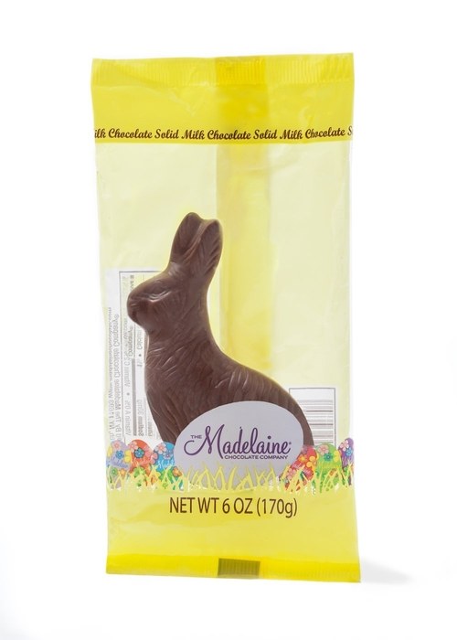 Highly detailed 6 oz. sitting rabbit made of solid premium milk chocolate. Packaged in a cellophane bag with yellow trim & colorful graphics. Perfect for any Easter basket or as an individual treat