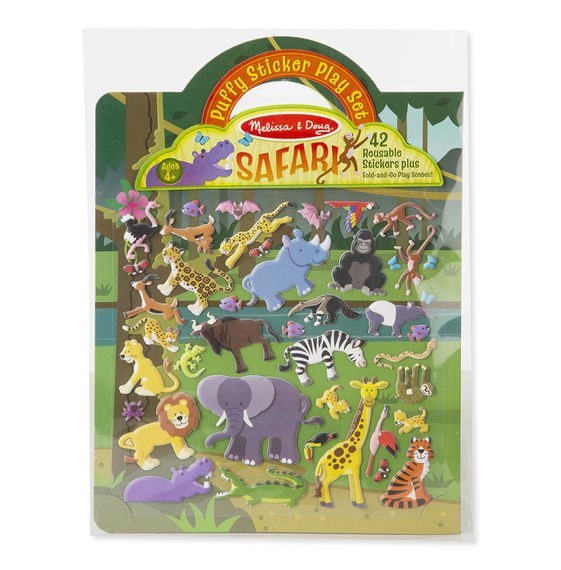 Enjoy endless animal adventures with dozens of wild creatures! This reusable puffy sticker set includes a sturdy double-sided, fold-out background panel, plus 42 puffy stickers. Use the stickers to fill savannah or jungle scene with big cats, birds, elephants, hippos, and more. Easy to place, layer, and reposition, the reusable stickers make it easy to tell a story of safari adventure. Simply place the puffy stickers on the board, then change the picture whenever you're ready to change the story! The built-in sticker collection offers endless opportunities for kids to express their creativity, all while improving fine motor skills and communication. A diecut handle and fold-and-go format make this kids' sticker activity set great for travel, too!